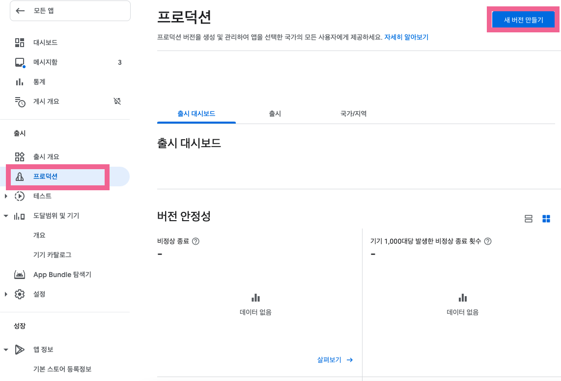 2. 출시 - 프로덕션 - 새 버전 만들기를 선택합니다.