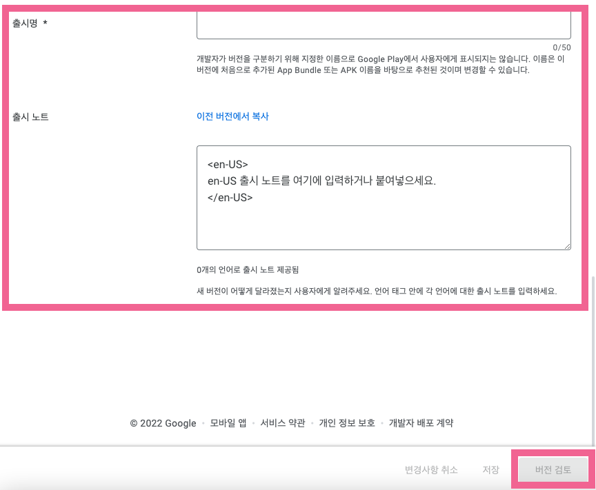 4. 버전 세부정보를 입력합니다. App Bundle을 올리시고 나면 출시명이 변경되어 있을겁니다. 이 출시명은 유저에게는 보이지않고 본인만 확인할 수 있다고 하니 그대로 올리셔도 될 것 같습니다. 대신 출시 노트는 유저에게 보여지는 내용이니 변경된 부분을 설명하시면 됩니다.