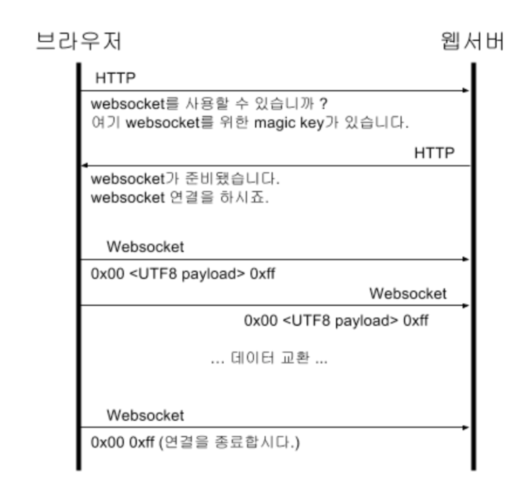 ・ tcp socket은 바이트 스트림을 사용하지만 web socket은 utp-8 텍스트와 바이너리 둘 다 보낼 수 있다.