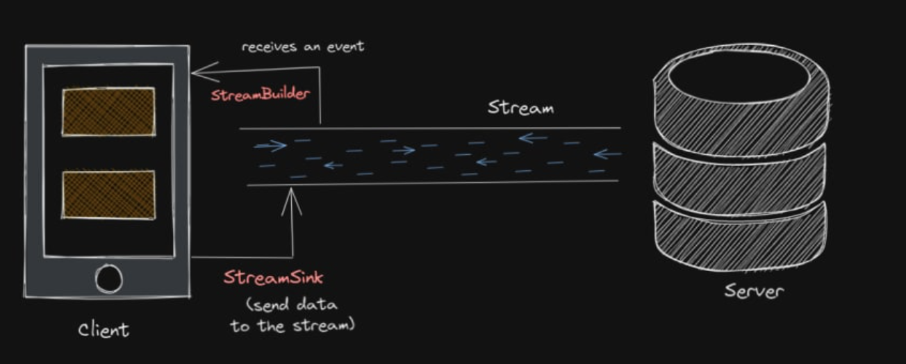 각 streamchannel은 데이터를 수신하기 위해 stream을 공개합니다. stream은 파이프와 같이 한쪽 끝에 값을 놓으면 다른 끝에 수신자가 있는 경우 해당 값을 수신합니다. 그리고 메시지를 서버에 푸시하기 위해서는 streamsink를 사용합니다.