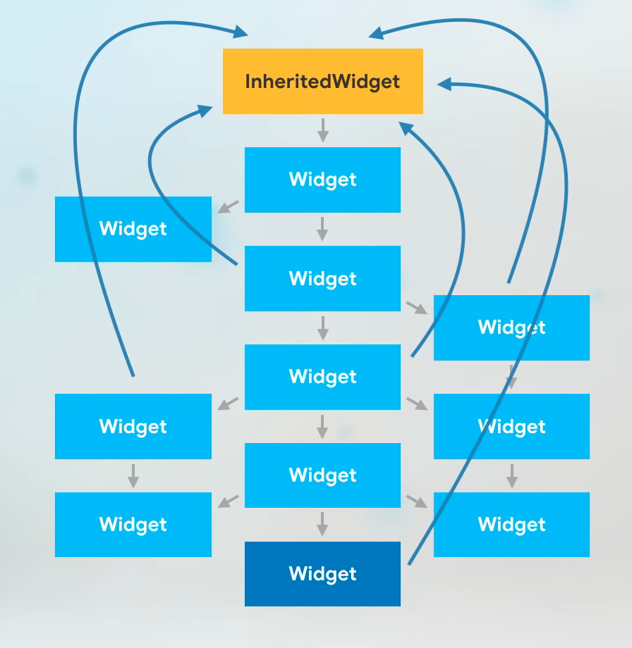 - 빌드 컨텍스트로부터 상속된 데이터를 얻으며 BuildContext.dependOnInheritedWidgetOfExactType를 사용해서 가장 가까운 인스턴스를 가져옵니다.