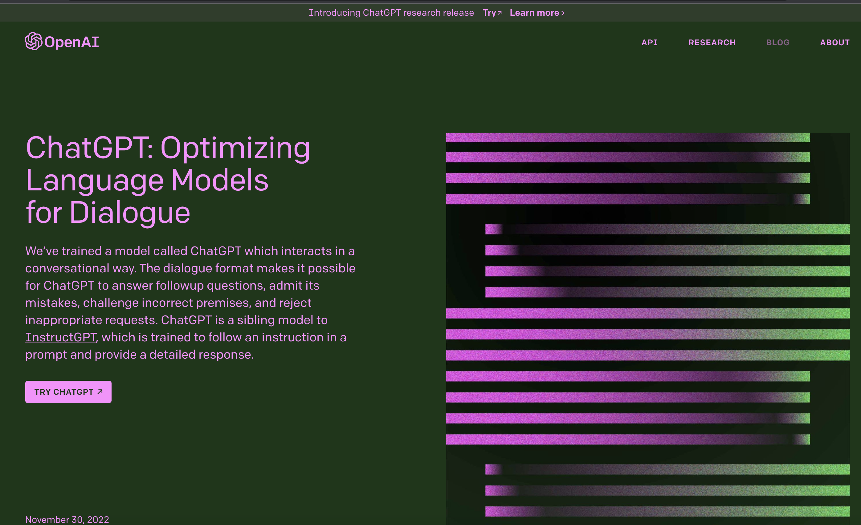 공식페이지가 매우 화려합니다. 공식 페이지에 따르면 채팅 GPT는 최적화 언어 모델로 대화 방식으로 상호 작용하는 ai입니다.