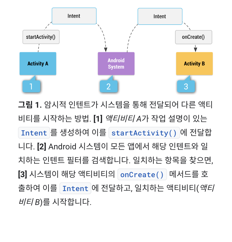 앱 액티비티, 서비스, Broadcast Receiver는 인텐트로 활성화됩니다. 인텐트는 실행할 작업을 설명하는 Intent 객체로 정의되는 메시지입니다. 여기에는 작업할 데이터, 작업을 수행해야 하는 구성 요소의 카테고리 및 기타 지침이 포함됩니다.