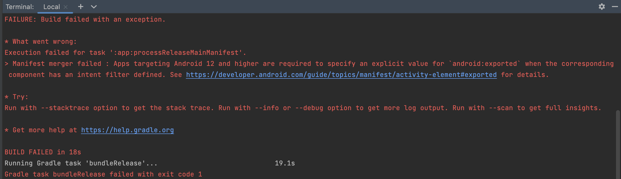 Execution failed for task ':app:processReleaseMainManifest' Manifest merger failed : Apps targeting Android 12 and higher are required to specify an explicit value for android:exported when the