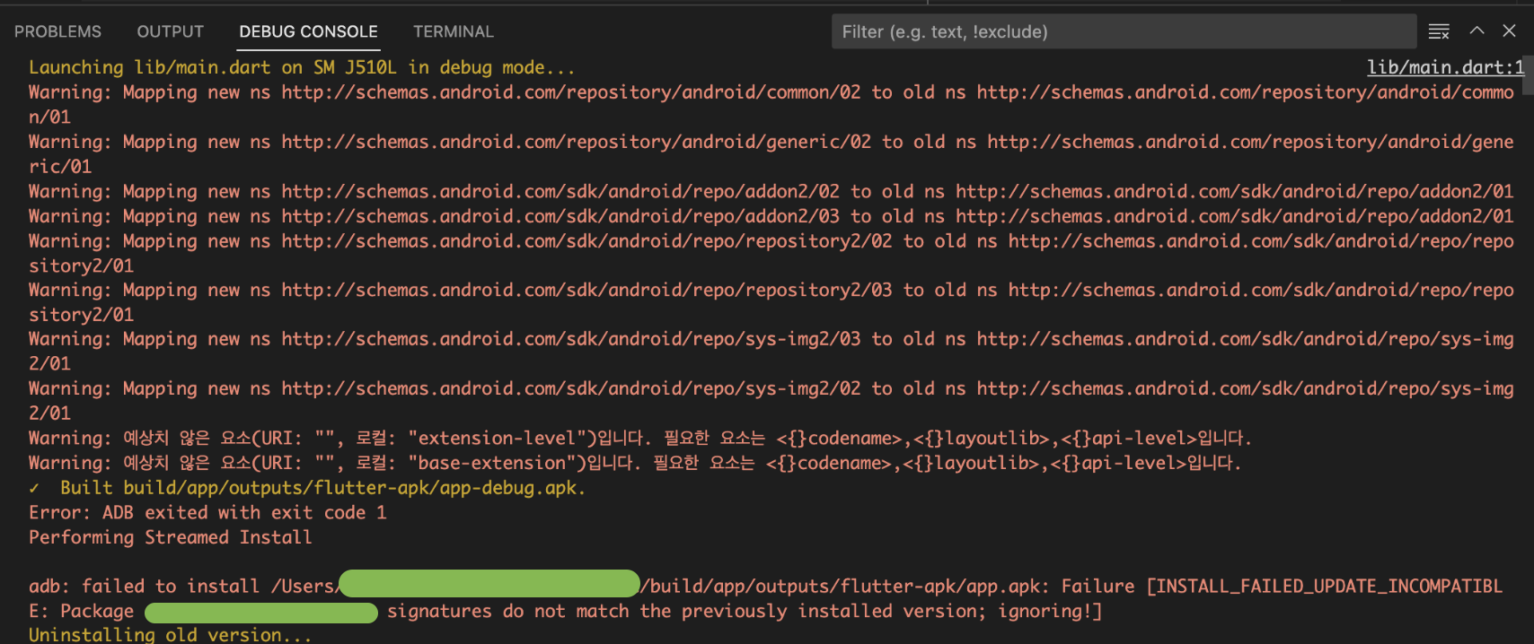 아무리 뒤져봐도 알수없는 에러.. 그러다가 문득 에러가 부족하다는 생각이 들었습니다. 저는 원래 vscode를 사용해서 플러터 개발을 진행하고 있었는데 회사에서 안드로이드 스튜디오를 사용하면서 집에서도 안드로이드 스튜디오와 더 친해지기 위해 환경을 맞춰뒀는데 익숙한 환경으로 돌아가기 위해 vscode를 켰고 다른 에러를 발견했습니다..!