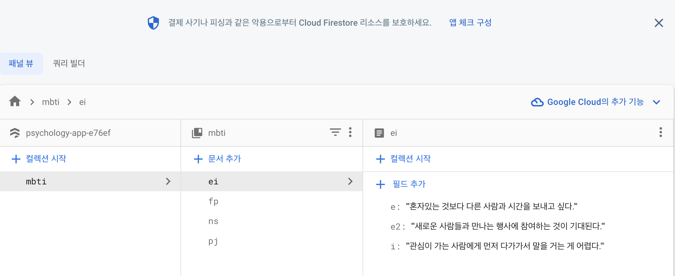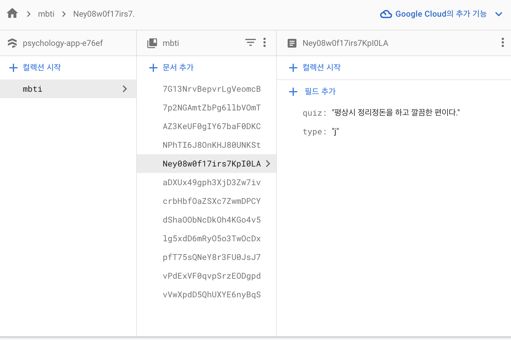 cloud_firestore와 실시간데이터베이스 중 어떤 플러그인을 사용할까 고민했는데 저의 경우는 간단한 심리테스트 앱에 연결할 서버가 필요했던 경우라 cloud_firestore로 선택했습니다. 실시간 데이터베이스의 경우에는 커뮤니티 앱, 채팅앱에 더 적합한 것 같습니다.