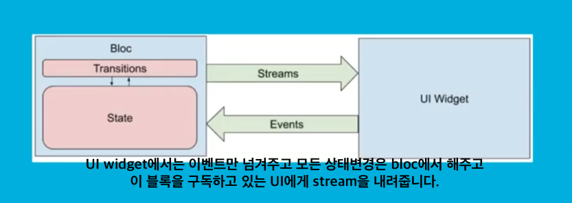 ・ 목적 : Flutter의 상태 관리를 분리하여 제어하기 위해 구글 개발자에 의해 만들어진 패턴입니다. UI와 Bussiness Logic을 분리하여 각각 코드의 의존성을 낮춰줍니다.